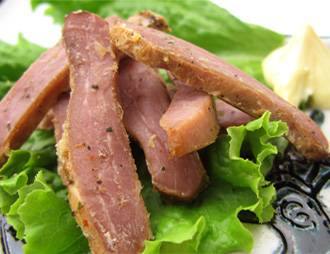 ほんのりと付いた塩と黒胡椒の味の向こうから、優しいスモークチップの香りが広がってくる。 その香りを楽しみながら2度3度と噛み締めるていると、沖縄県産豚の赤身肉の深い味わいが徐々に染み出してきた。 噛む度に細かくちぎれていくぶたりめ。ちぎれながらも、中に隠れた旨味を放出し続けるさまに、喉に通すのをためらってしまう。 ようやく喉を通した頃には、私の右手が自然と2つ目のぶたりめを口に運んでいた(笑)。 |